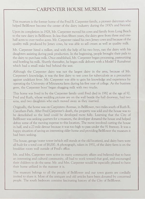This page tells the story of how the Carpenter home came to be Bellflower's first museum, through photographs and newspaper articles